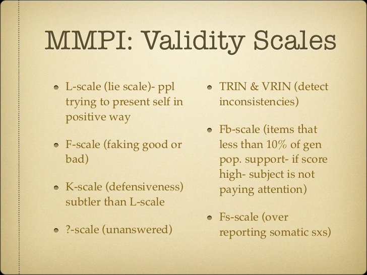 The MMPI consists of Validity Scales and Content (Basic) Scales. The creators of the MMPI were aware of the fakability of a verbal inventory and they attempted to develop several validity indicators. These are internal measures that would point to the individual who was not responding honestly.3
