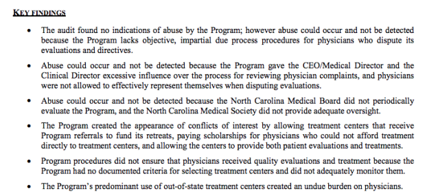 “Abuse could occur and not be detected…because physicians were not allowed to effectively represent themselves when disputing evaluations… [and because] the North Carolina Medical Board did not periodically evaluate the Program and the North Carolina Medical Society did not provide adequate oversight,” the auditor’s report noted.